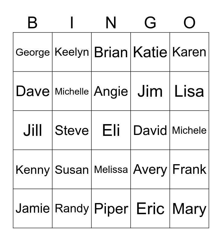 This bingo card has a free space and 24 words: Susan, Randy, Angie, Jamie, Karen, George, Dave, Keelyn, David, Melissa, Jim, Jill, Avery, Frank, Michelle, Eric, Michele, Brian, Lisa, Steve, Mary, Kenny, Katie and Piper.