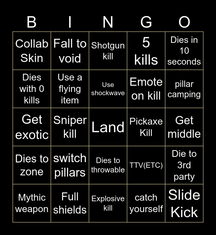 This bingo card has a free space and 24 words: Mythic weapon, switch pillars, Use shockwave, catch yourself, Dies in 10 seconds, Collab Skin, Fall to void, Shotgun kill, Pickaxe Kill, Get middle, Get exotic, Use a flying item, TTV(ETC), Die to 3rd party, Dies with 0 kills, Full shields, Explosive kill, 5 kills, pillar camping, Dies to zone, Sniper kill, Dies to throwable, Emote on kill and Slide Kick.