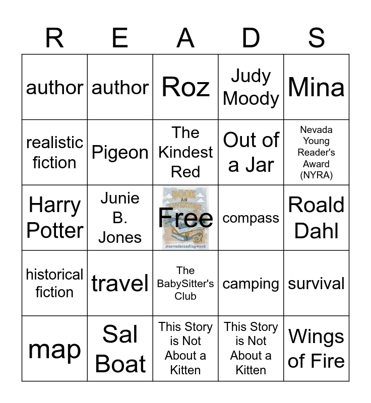 ⚠ This card has duplicate items: Caldcott Medal (2), author (2), Destiny Discover (2), illustrator (2), Nevada Young Reader's Award (NYRA) (2), realistic fiction (2), historical fiction (2), Roald Dahl (2), Katherine Applegate (2), Kate DiCamillo (2), Lauren Tarshis (2), Gary Paulsen (2), Dav Pilkey (2), Jeff Kinney (2), Jon Klassen (2), Don't Let the Pigeon Drive the Bus! (2), This Story is Not About a Kitten (2), Mina (2), Buffalo Fluffalo (2), Too Many Pigs and One Big Bad Wolf (2), The Kindest Red (2), Out of a Jar (2), Sal Boat (2), An American Story (2), The One and Only Ivan (2), Hatchet (2), Wings of Fire (2), Smile (2), The BabySitter's Club (2), Warriors (2), Harry Potter (2), Junie B. Jones (2), Pete the Cat (2), Roz (2), Pigeon (2), Greg Heffley (2), Piggie and Gerald (2), Judy Moody (2), Jack and Annie (2), adventure (2), compass (2), survival (2), journey (2), imagination (2), voyage (2), explore (2), time (2), travel (2), quest (2), camping (2), discovery (2), map (2), hero (2), courage (2), challenge (2), The Lightning Thief (2), graphic novels (2), manga (2), Mother Bruce (2), Cat & Cat Adventures (2), Wonder (2), Dragons and Marshmallows (2), underwater (2), frontier (2)