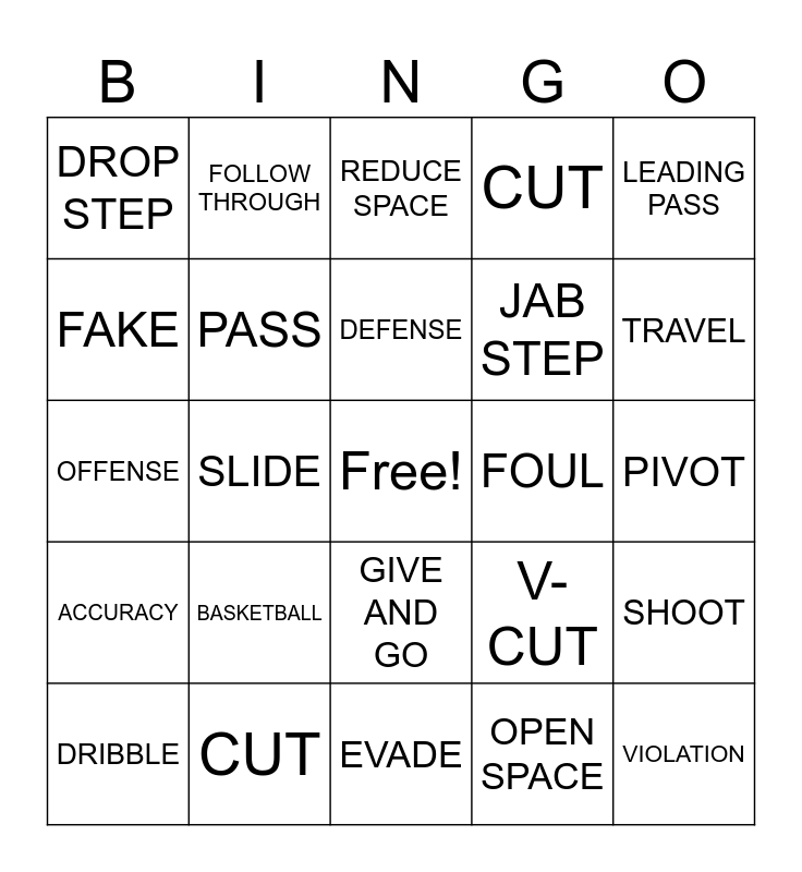 This bingo card has a free space and 24 words: BASKETBALL, CUT, DEFENSE, DRIBBLE, LEADING PASS, DROP STEP, FAKE, FOLLOW THROUGH, FOUL, GIVE AND GO, JAB STEP, OFFENSE, V-CUT, SHOOT, PASS, OPEN SPACE, PIVOT, REDUCE SPACE, TRAVEL, SLIDE, VIOLATION, ACCURACY, CUT and EVADE.