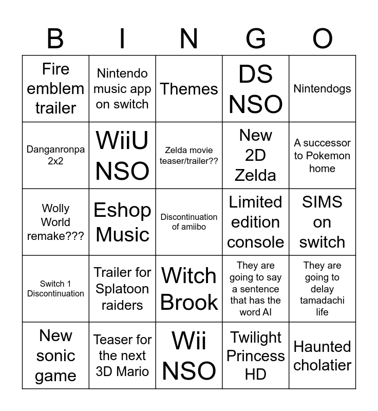 This bingo card has a free space and 24 words: Trailer for Splatoon raiders, Teaser for the next 3D Mario, Zelda movie teaser/trailer??, New sonic game, Nintendogs, Fire emblem trailer, Danganronpa 2x2, Nintendo music app on switch, Limited edition console, Witch Brook, New 2D Zelda, Wolly World remake???, They are going to say a sentence that has the word AI, They are going to delay tamadachi life, WiiU NSO, Twilight Princess HD, SIMS on switch, Themes, A successor to Pokemon home, Eshop Music, Haunted cholatier, Switch 1 Discontinuation, DS NSO and Wii NSO.