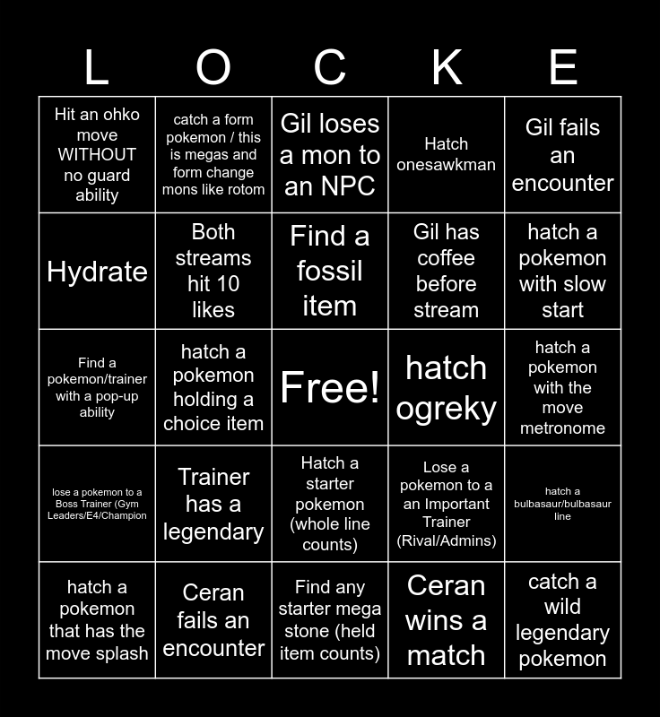 This bingo card has a free space and 44 words: Get a crit catch, catch a wild legendary pokemon, Hatch a mon with explosion, hatch a pokemon that has the move splash, Gil wins a match, Ceran wins a match, Gil loses a mon to an NPC, Ceran loses a mon to an NPC, Gil fails an encounter, Ceran fails an encounter, Hatch onesawkman, hatch ogreky, Hatch a starter pokemon (whole line counts), Trainer has a legendary, Find a treasure item in the wild, Find any starter mega stone (held item counts), Find any legendary mega stone (held item counts), Find a pokemon/trainer with a pop-up ability, Hatch a pokemon with Truant, hatch a pokemon with slow start, catch a form pokemon / this is megas and form change mons like rotom, Gil gets swept in the cage match, Ceran gets swept in the match, Hit an ohko move WITHOUT no guard ability, Hatch a shiny pokemon, hatch a pokemon with the move metronome, hatch a stage 1 pokemon, Hatch a mega pokemon, Lose a pokemon to a an Important Trainer (Rival/Admins), lose a pokemon to a Boss Trainer (Gym Leaders/E4/Champion, Hatch a fossil pokemon, hatch a bulbasaur/bulbasaur line, hatch a duskull/duskull line, hatch a pokemon holding life orb, hatch a pokemon holding a choice item, Pee break, Stream is scuffed, Gil gets lost, Find a fossil item, Hydrate, Gil has coffee before stream, Hatch a legendary, Both streams hit 10 likes and Hatch a mon with a healing item (leftovers/berries/etc.).