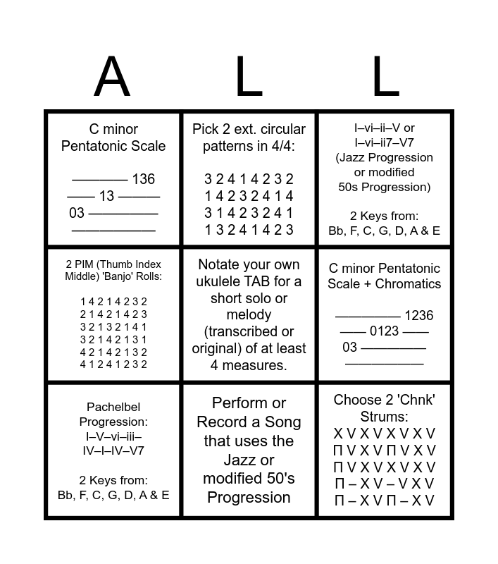 This bingo card has 9 words: Pachelbel Progression: I–V–vi–iii– IV–I–IV–V7 2 Keys from: Bb, F, C, G, D, A & E, I–vi–ii–V or I–vi–ii7–V7 (Jazz Progression or modified 50s Progression) 2 Keys from: Bb, F, C, G, D, A & E, Pick 2 ext. circular patterns in 4/4: 3 2 4 1 4 2 3 2 1 4 2 3 2 4 1 4 3 1 4 2 3 2 4 1 1 3 2 4 1 4 2 3, 2 PIM (Thumb Index Middle) 'Banjo' Rolls: 1 4 2 1 4 2 3 2 2 1 4 2 1 4 2 3 3 2 1 3 2 1 4 1 3 2 1 4 2 1 3 1 4 2 1 4 2 1 3 2 4 1 2 4 1 2 3 2, C minor Pentatonic Scale ———— 136 —— 13 ——— 03 ————— ——————, C minor Pentatonic Scale + Chromatics ————— 1236 —— 0123 —— 03 ————— ——————, Notate your own ukulele TAB for a short solo or melody (transcribed or original) of at least 4 measures., Choose 2 'Chnk' Strums: X V X V X V X V Π V X V Π V X V Π V X V X V X V Π – X V – V X V Π – X V Π – X V and Perform or Record a Song that uses the Jazz or modified 50's Progression.
