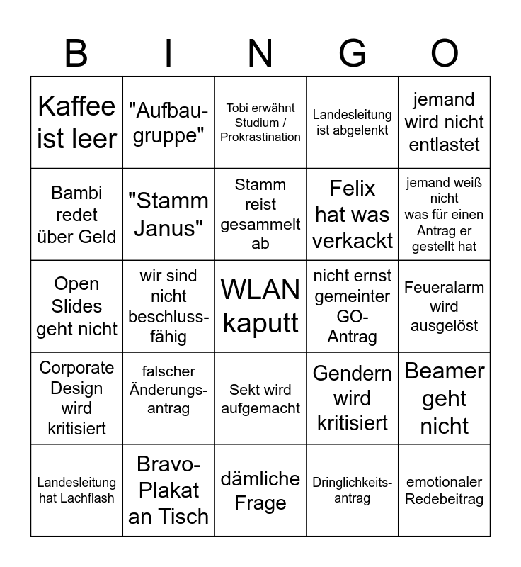 This bingo card has 27 words: Gendern wird kritisiert, emotionaler Redebeitrag, Felix hat was verkackt, dämliche Frage, Bambi redet über Geld, Tobi erwähnt Studium / Prokrastination, "Aufbau-gruppe", Corporate Design wird kritisiert, nicht ernst gemeinter GO-Antrag, Beamer geht nicht, Open Slides geht nicht, Landesleitung ist abgelenkt, Landesleitung hat Lachflash, Bravo-Plakat an Tisch, jemand weiß nicht was für einen Antrag er gestellt hat, "Stamm Störtebeker", "Stamm Janus", Stamm reist gesammelt ab, falscher Änderungs-antrag, Kaffee ist leer, Feueralarm wird ausgelöst, Dringlichkeits- antrag, wir sind nicht beschluss- fähig, WLAN kaputt, Sekt wird aufgemacht, jemand wird nicht entlastet and über Kasse wird gemeckert.
