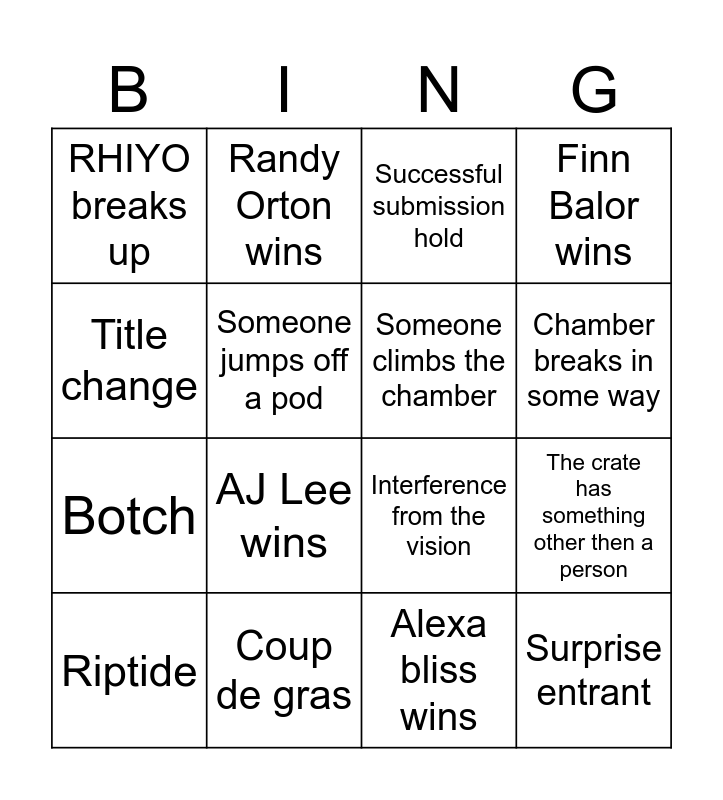 This bingo card has 16 words: Coup de gras, The crate has something other then a person, Successful submission hold, RHIYO breaks up, Botch, Randy Orton wins, Interference from the vision, Alexa bliss wins, Title change, Someone jumps off a pod, Riptide, Finn Balor wins, AJ Lee wins, Chamber breaks in some way, Someone climbs the chamber and Surprise entrant.