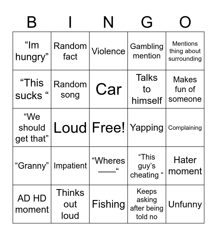 This bingo card has a free space and 24 words: Impatient, Thinks out loud, Car, AD HD moment, Mentions thing about surrounding, “Im hungry”, “This sucks “, Random fact, Yapping, “Wheres ——“, Talks to himself, “We should get that”, “This guy’s cheating “, Hater moment, Random song, Keeps asking after being told no, Complaining, Violence, Makes fun of someone, Loud, Unfunny, “Granny”, Gambling mention and Fishing.