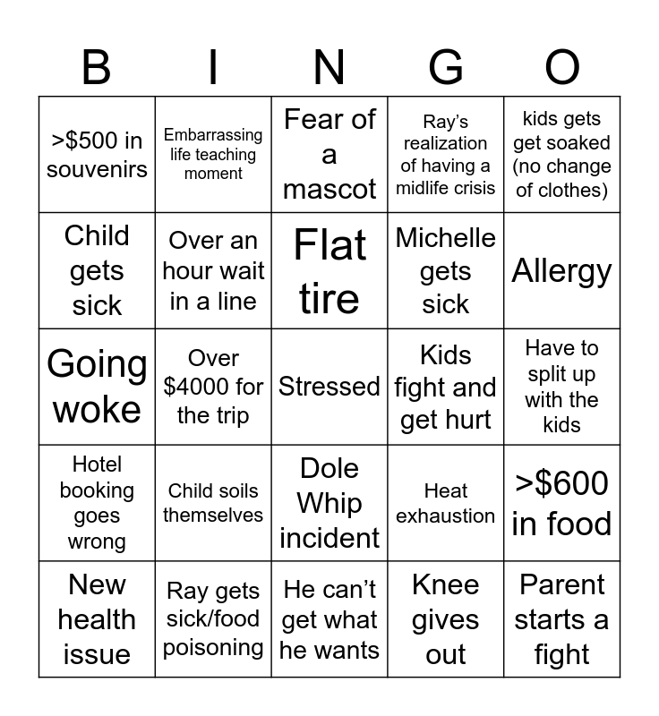 This bingo card has a free space and 24 words: Child soils themselves, Ray gets sick/food poisoning, Flat tire, New health issue, kids gets get soaked (no change of clothes), >$500 in souvenirs, Child gets sick, Embarrassing life teaching moment, Kids fight and get hurt, Dole Whip incident, Michelle gets sick, Going woke, Heat exhaustion, >$600 in food, Over an hour wait in a line, Knee gives out, Have to split up with the kids, Fear of a mascot, Allergy, Over $4000 for the trip, Parent starts a fight, Hotel booking goes wrong, Ray’s realization of having a midlife crisis and He can’t get what he wants.