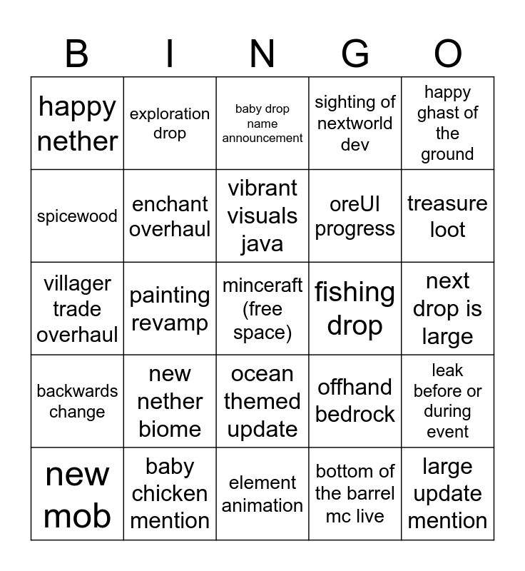This bingo card has a free space and 24 words: new nether biome, baby chicken mention, vibrant visuals java, new mob, happy ghast of the ground, happy nether, spicewood, exploration drop, fishing drop, ocean themed update, oreUI progress, villager trade overhaul, offhand bedrock, leak before or during event, enchant overhaul, bottom of the barrel mc live, next drop is large, baby drop name announcement, treasure loot, painting revamp, large update mention, backwards change, sighting of nextworld dev and element animation.