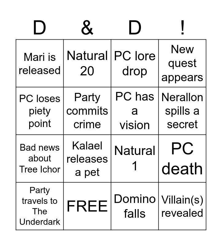 This bingo card has 16 words: FREE, PC death, PC lore drop, Mari is released, Bad news about Tree Ichor, Natural 20, Natural 1, Domino falls, PC loses piety point, Party commits crime, Party travels to The Underdark, New quest appears, Kalael releases a pet, Nerallon spills a secret, PC has a vision and Villain(s) revealed.