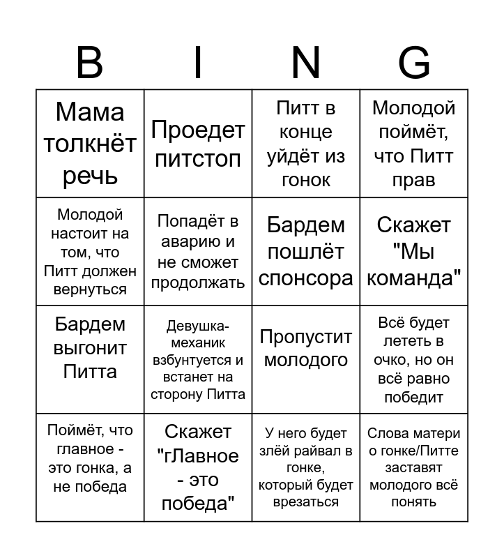 This bingo card has 16 words: Скажет "гЛавное - это победа", Всё будет лететь в очко, но он всё равно победит, Питт в конце уйдёт из гонок, Мама толкнёт речь, Бардем выгонит Питта, Проедет питстоп, Пропустит молодого, У него будет злёй райвал в гонке, который будет врезаться, Молодой настоит на том, что Питт должен вернуться, Попадёт в аварию и не сможет продолжать, Поймёт, что главное - это гонка, а не победа, Молодой поймёт, что Питт прав, Девушка-механик взбунтуется и встанет на сторону Питта, Скажет "Мы команда", Бардем пошлёт спонсора and Слова матери о гонке/Питте заставят молодого всё понять.