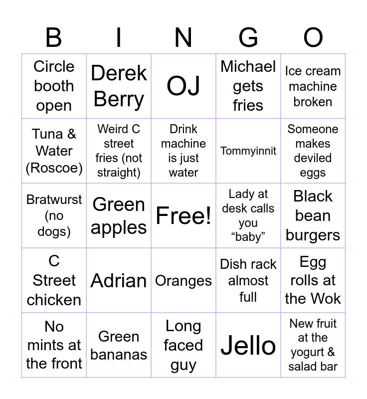 This bingo card has a free space and 24 words: Adrian, Green bananas, Drink machine is just water, No mints at the front, Ice cream machine broken, Circle booth open, Tuna & Water (Roscoe), Derek Berry, Lady at desk calls you “baby”, Oranges, Tommyinnit, Bratwurst (no dogs), Dish rack almost full, Egg rolls at the Wok, Weird C street fries (not straight), Jello, Black bean burgers, OJ, Someone makes deviled eggs, Green apples, New fruit at the yogurt & salad bar, C Street chicken, Michael gets fries and Long faced guy.
