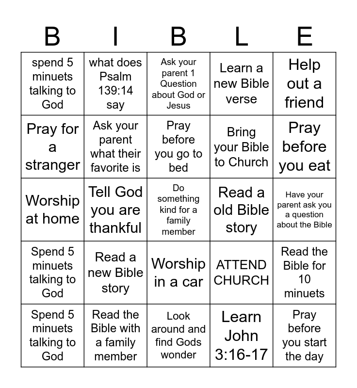 This bingo card has 25 words: Read a new Bible story, Look around and find Gods wonder, Pray before you go to bed, Spend 5 minuets talking to God, Help out a friend, spend 5 minuets talking to God, Pray for a stranger, what does Psalm 139:14 say, Read a old Bible story, Worship in a car, Bring your Bible to Church, Worship at home, ATTEND CHURCH, Read the Bible for 10 minuets, Ask your parent what their favorite is, Pray before you start the day, Have your parent ask you a question about the Bible, Ask your parent 1 Question about God or Jesus, Pray before you eat, Tell God you are thankful, Do something kind for a family member, Read the Bible with a family member, Spend 5 minuets talking to God, Learn a new Bible verse and Learn John 3:16-17.