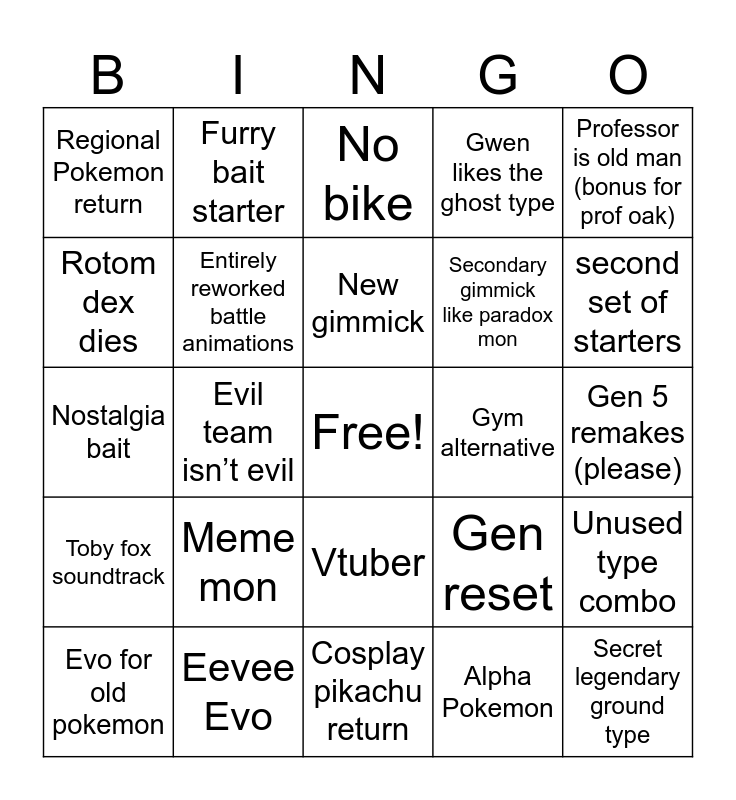This bingo card has a free space and 24 words: Meme mon, Eevee Evo, New gimmick, Evo for old pokemon, Professor is old man (bonus for prof oak), Regional Pokemon return, Rotom dex dies, Furry bait starter, Gym alternative, Vtuber, Secondary gimmick like paradox mon, Nostalgia bait, Gen reset, Unused type combo, Entirely reworked battle animations, Alpha Pokemon, Gen 5 remakes (please), No bike, second set of starters, Evil team isn’t evil, Secret legendary ground type, Toby fox soundtrack, Gwen likes the ghost type and Cosplay pikachu return.