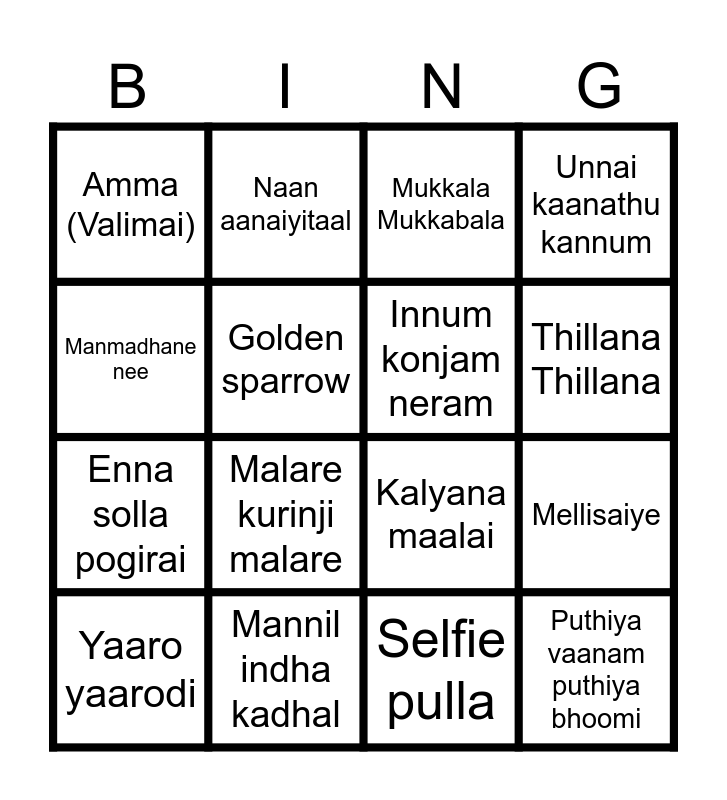 This bingo card has 67 words: Free!, Chinna chinna aasai, Romeo aatham pothaal, Google google, Aathi enna nee, Minsara kanna, Naan aanaiyitaal, Azhagiya Laila, Thillana Thillana, Thalapathy Kacheri, Maanguyilae poonguyilae, Ennavo Ennavo, Selfie pulla, Manmadhane nee, Innisai paadi varum, Golden sparrow, Mellisaiye, Amma (Valimai), Oru deivam thande poove, Enna solla pogirai, Sundari kannal oru seithi, Puthiya vaanam puthiya bhoomi, Unnai kaanathu kannum, Raja raja Chozhan naan, Vaarayo vaarayo, Unnai paartha pinbu, Adho andha paravai pole, Megamai vanthu pogiren, Malare kurinji malare, Nila athu vaanathumele, Yaaro yaarodi, Amma endrazhaikaatha, Aayiram jannal veedu, Engal veethil ella naalum karthigai, Munbe vaa, Vennilave saaral nee, Enakke enakkaa, Malare mounama, Kalyana maalai, Ennodu nee irundhaal, Pookal pookum tharunam, Innum konjam neram, Mannil indha kadhal, Pottala Muttaya, Water packet, Oorum blood, Manasilaayo, Ranjithame, Rowdy baby, Thillana thillana, Mukkala Mukkabala, Soniya Soniya, Onakkaage Poranthaenae, Enna Ninatche, Appadi podu, Nadiye Nadiye, Nee singam thaan, Mudhal kanave, Amma (Varisu), Aal thotha boopathi, Vaayadi petta pillai, Tenmerku paravai Kaatru, Thithikudhe, Pogiren, Singapenne, Oru ooril and Devadai vamsam.