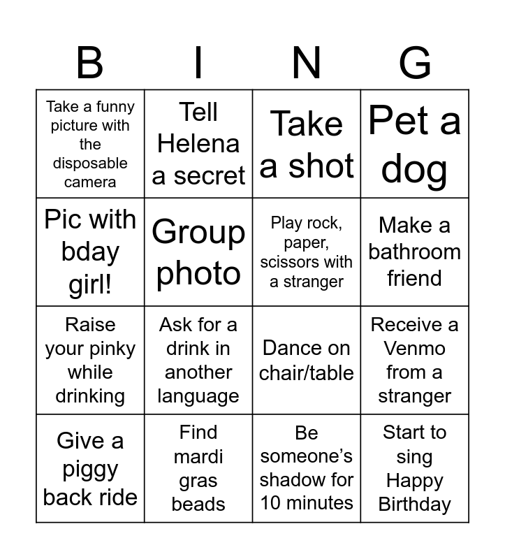 This bingo card has 16 words: Find mardi gras beads, Receive a Venmo from a stranger, Take a shot, Take a funny picture with the disposable camera, Raise your pinky while drinking, Tell Helena a secret, Dance on chair/table, Be someone’s shadow for 10 minutes, Pic with bday girl!, Group photo, Give a piggy back ride, Pet a dog, Ask for a drink in another language, Make a bathroom friend, Play rock, paper, scissors with a stranger and Start to sing Happy Birthday.