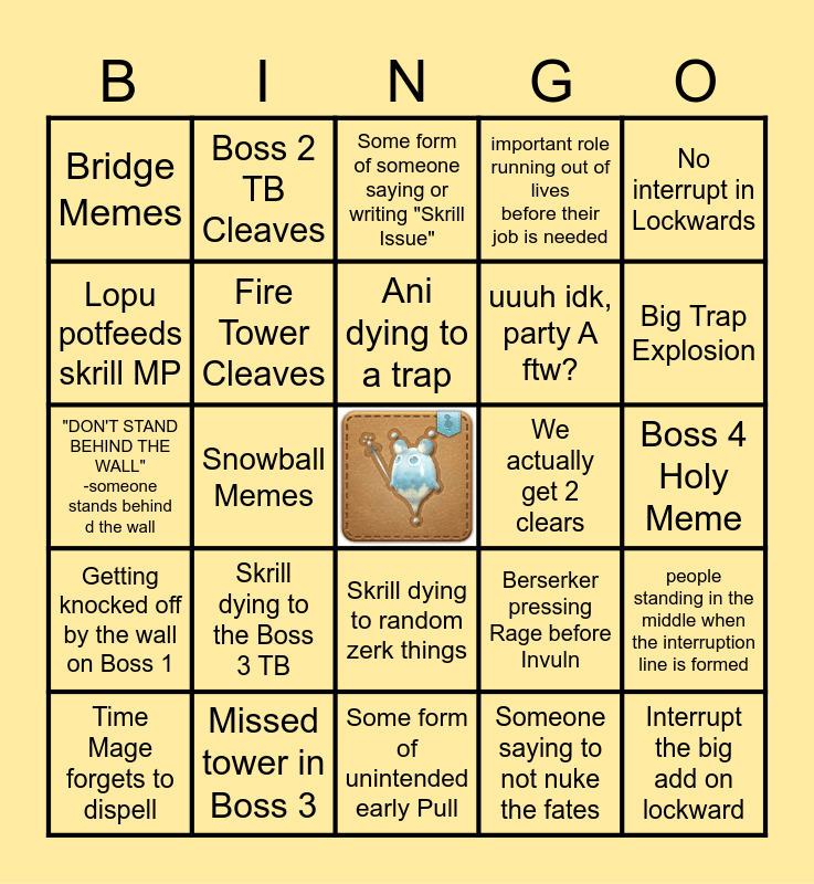 This bingo card has a free space and 24 words: Skrill dying to the Boss 3 TB, Missed tower in Boss 3, Ani dying to a trap, Time Mage forgets to dispell, No interrupt in Lockwards, Bridge Memes, Lopu potfeeds skrill MP, Boss 2 TB Cleaves, We actually get 2 clears, Skrill dying to random zerk things, uuuh idk, party A ftw?, "DON'T STAND BEHIND THE WALL" -someone stands behind d the wall, Berserker pressing Rage before Invuln, people standing in the middle when the interruption line is formed, Fire Tower Cleaves, Someone saying to not nuke the fates, Boss 4 Holy Meme, Some form of someone saying or writing "Skrill Issue", Big Trap Explosion, Snowball Memes, Interrupt the big add on lockward, Getting knocked off by the wall on Boss 1, important role running out of lives before their job is needed and Some form of unintended early Pull.
