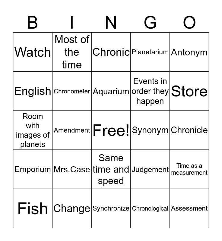 This bingo card has a free space and 24 words: Mrs.Case, Change, Aquarium, Fish, Antonym, Watch, English, Most of the time, Synonym, Same time and speed, Events in order they happen, Room with images of planets, Judgement, Time as a measurement, Chronometer, Chronological, Chronicle, Chronic, Store, Amendment, Assessment, Emporium, Planetarium and Synchronize.