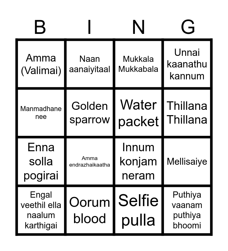This bingo card has 67 words: Free!, Chinna chinna aasai, Romeo aatham pothaal, Google google, Aathi enna nee, Minsara kanna, Naan aanaiyitaal, Azhagiya Laila, Thillana Thillana, Thalapathy Kacheri, Maanguyilae poonguyilae, Ennavo Ennavo, Selfie pulla, Manmadhane nee, Innisai paadi varum, Golden sparrow, Mellisaiye, Amma (Valimai), Oru deivam thande poove, Enna solla pogirai, Sundari kannal oru seithi, Puthiya vaanam puthiya bhoomi, Unnai kaanathu kannum, Raja raja Chozhan naan, Vaarayo vaarayo, Unnai paartha pinbu, Adho andha paravai pole, Megamai vanthu pogiren, Amma endrazhaikaatha, Aayiram jannal veedu, Engal veethil ella naalum karthigai, Munbe vaa, Vennilave saaral nee, Enakke enakkaa, Malare mounama, Kalyana maalai, Ennodu nee irundhaal, Pookal pookum tharunam, Innum konjam neram, Mannil indha kadhal, Pottala Muttaya, Water packet, Oorum blood, Manasilaayo, Onakkaage Poranthaenae, Enna Ninatche, Appadi podu, Ranjithame, Rowdy baby, Thillana thillana, Mukkala Mukkabala, Soniya Soniya, Nadiye Nadiye, Nee singam thaan, Mudhal kanave, Amma (Varisu), Aal thotha boopathi, Vaayadi petta pillai, Tenmerku paravai Kaatru, Thithikudhe, Pogiren, Singapenne, Oru ooril, Devadai vamsam, Malare kurinji malare, Nila athu vaanathumele and Yaaro yaarodi.