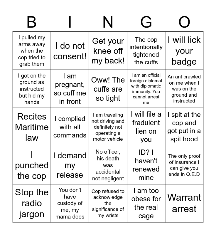 This bingo card has a free space and 24 words: I demand my release, You don't have custody of me, my mama does, Oww! The cuffs are so tight, Stop the radio jargon, I will lick your badge, I pulled my arms away when the cop tried to grab them, I got on the ground as instructed but hid my hands, I do not consent!, I will file a fradulent lien on you, No officer, his death was accidental not negligent, I am an official foreign diplomat with diplomatic immunity. You cannot arrest me, Recites Maritime law, ID? I haven't renewed mine, The only proof of insurance I can give you ends in Q.E.D, I am pregnant, so cuff me in front, I am too obese for the real cage, I spit at the cop and got put in a spit hood, Get your knee off my back!, An ant crawled on me when I was on the ground and instructed, I complied with all commands, Warrant arrest, I punched the cop, The cop intentionally tightened the cuffs and Cop refused to acknowledge the significance of my wrists.