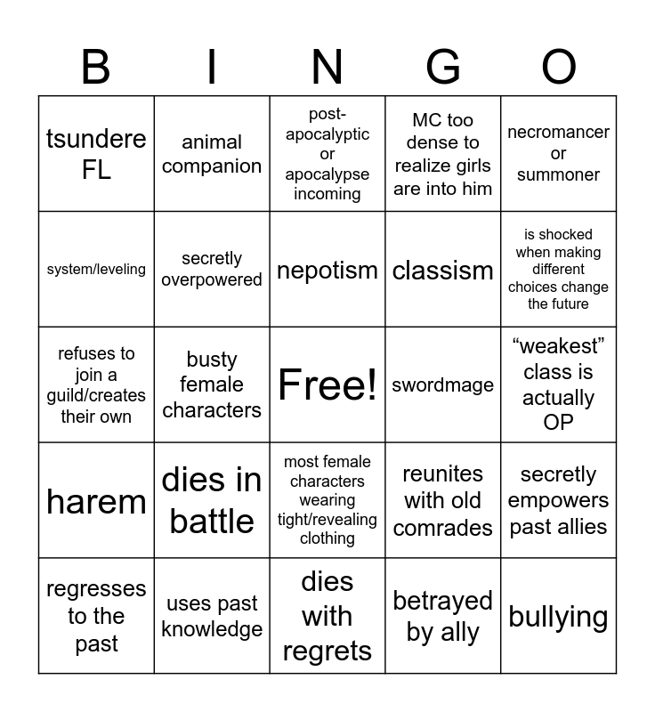 This bingo card has a free space and 24 words: dies in battle, uses past knowledge, nepotism, regresses to the past, necromancer or summoner, tsundere FL, system/leveling, animal companion, swordmage, most female characters wearing tight/revealing clothing, classism, refuses to join a guild/creates their own, reunites with old comrades, secretly empowers past allies, secretly overpowered, betrayed by ally, “weakest” class is actually OP, post-apocalyptic or apocalypse incoming, is shocked when making different choices change the future, busty female characters, bullying, harem, MC too dense to realize girls are into him and dies with regrets.