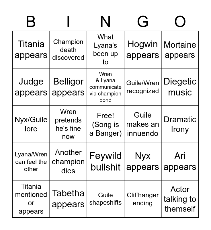 This bingo card has a free space and 24 words: Another champion dies, Tabetha appears, Wren & Lyana communicate via champion bond, Titania mentioned or appears, Mortaine appears, Titania appears, Judge appears, Champion death discovered, Guile makes an innuendo, Feywild bullshit, Guile/Wren recognized, Nyx/Guile lore, Nyx appears, Ari appears, Belligor appears, Cliffhanger ending, Dramatic Irony, What Lyana's been up to, Diegetic music, Wren pretends he's fine now, Actor talking to themself, Lyana/Wren can feel the other, Hogwin appears and Guile shapeshifts.