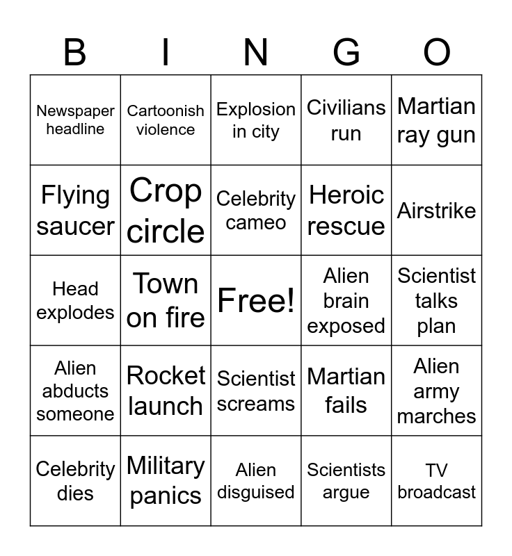 This bingo card has a free space and 40 words: Alien ships arrive, Head explodes, Laughing alien, Crop circle, Military panics, Scientist screams, Celebrity cameo, President reacts, Martian ray gun, Alien abducts someone, Town on fire, Civilians run, TV broadcast, Scientist talks plan, Alien brain exposed, Rocket launch, Famous landmark destroyed, Newspaper headline, Dog chased, Explosion in city, Alien army marches, Scientists argue, Heroic rescue, Flying saucer, Citizens scream, Alien laughs maniacally, Scientist experiments, Building collapses, Alien laser, Panic in streets, Government briefing, Celebrity dies, Heroic speech, Martian fails, Airstrike, Alien disguised, Close-up alien, Smoke clouds, Cartoonish violence and Final battle.