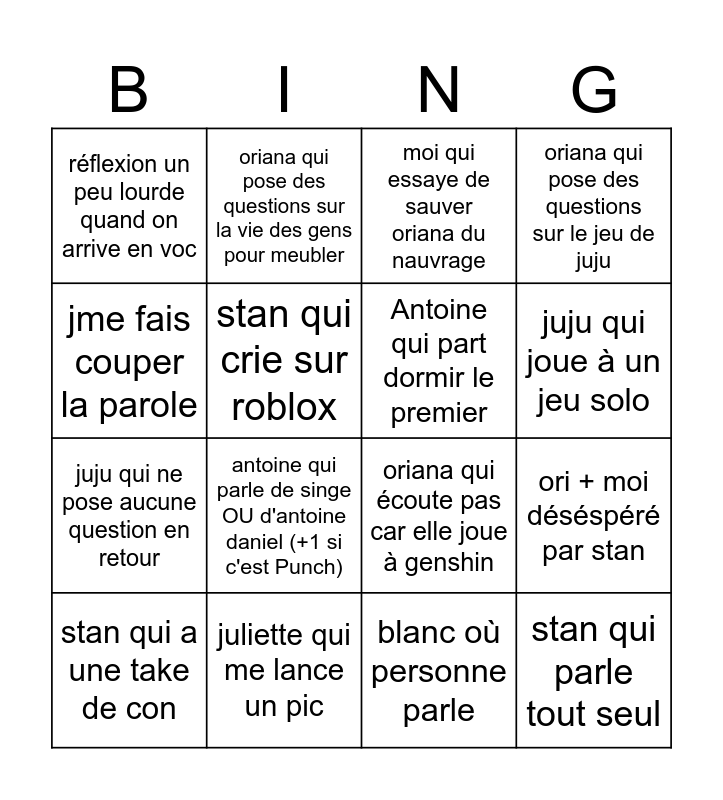 This bingo card has 17 words: blanc où personne parle, stan qui a une take de con, moi qui essaye de sauver oriana du nauvrage, réflexion un peu lourde quand on arrive en voc, antoine qui parle de singe OU d'antoine daniel (+1 si c'est Punch), oriana qui pose des questions sur le jeu de juju, ori + moi déséspéré par stan, Antoine qui part dormir le premier, juju qui joue à un jeu solo, stan qui crie sur roblox, juliette qui me lance un pic, oriana qui écoute pas car elle joue à genshin, jme fais couper la parole, oriana qui pose des questions sur la vie des gens pour meubler, juju qui ne pose aucune question en retour, antoine qui fait ouin ouin and stan qui parle tout seul.