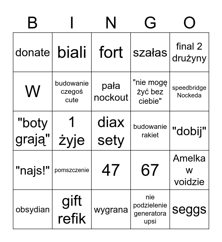 This bingo card has 25 words: pomszczenie, wygrana, pała nockout, obsydian, final 2 drużyny, donate, W, biali, budowanie rakiet, 47, "nie mogę żyć bez ciebie", "boty grają", 67, Amelka w voidzie, budowanie czegoś cute, seggs, "dobij", fort, speedbridge Nockeda, 1 żyje, diax sety, gift refik, "najs!", szałas and nie podzielenie generatora upsi.