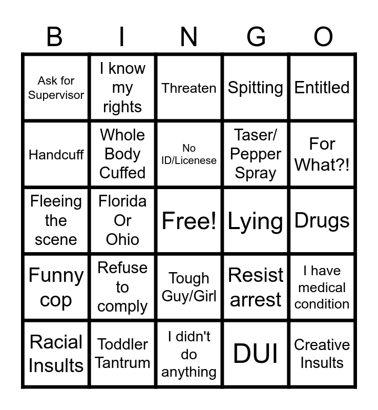 This bingo card has a free space and 24 words: Refuse to comply, Toddler Tantrum, No ID/Licenese, Racial Insults, Entitled, Ask for Supervisor, Handcuff, I know my rights, Lying, Tough Guy/Girl, Taser/ Pepper Spray, Fleeing the scene, Resist arrest, I have medical condition, Whole Body Cuffed, DUI, Drugs, Threaten, For What?!, Florida Or Ohio, Creative Insults, Funny cop, Spitting and I didn't do anything.