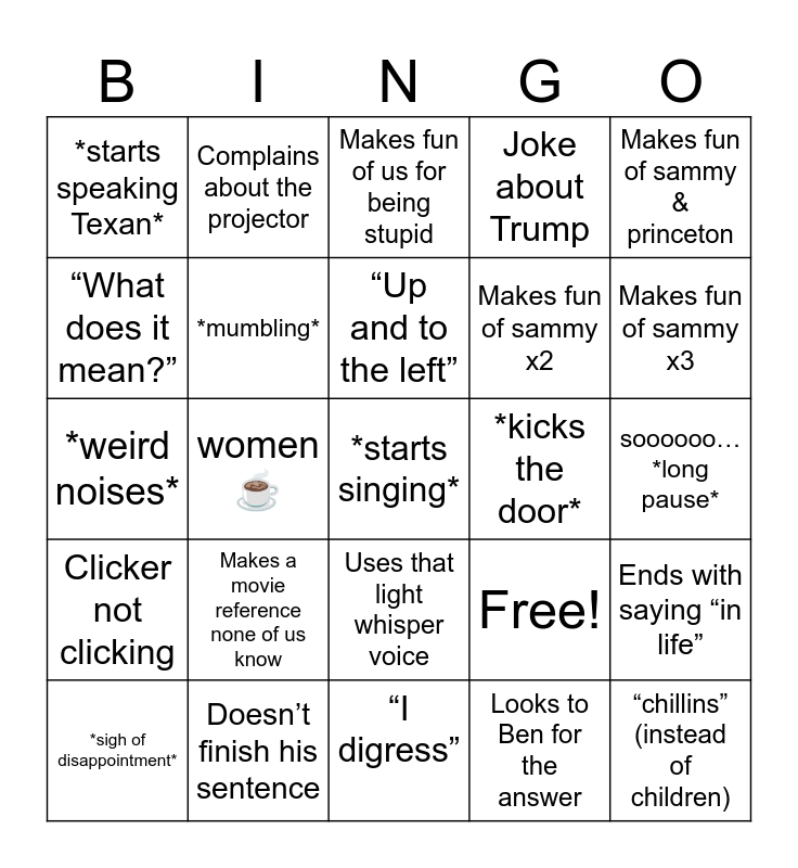 This bingo card has 25 words: Makes a movie reference none of us know, “I digress”, “Up and to the left”, *sigh of disappointment*, Makes fun of sammy & princeton, *starts speaking Texan*, “What does it mean?”, Complains about the projector, *kicks the door*, Uses that light whisper voice, Makes fun of sammy x2, *weird noises*, Free!, Ends with saying “in life”, *mumbling*, “chillins” (instead of children), soooooo…*long pause*, Makes fun of us for being stupid, Makes fun of sammy x3, women ☕, *starts singing*, Doesn’t finish his sentence, Clicker not clicking, Joke about Trump and Looks to Ben for the answer.
