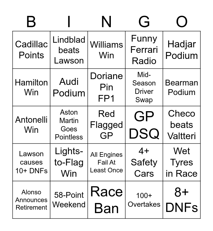 This bingo card has a free space and 24 words: Lights-to-Flag Win, 58-Point Weekend, Doriane Pin FP1, Alonso Announces Retirement, Hadjar Podium, Cadillac Points, Hamilton Win, Lindblad beats Lawson, GP DSQ, All Engines Fail At Least Once, Mid-Season Driver Swap, Antonelli Win, 4+ Safety Cars, Wet Tyres in Race, Audi Podium, 100+ Overtakes, Checo beats Valtteri, Williams Win, Bearman Podium, Aston Martin Goes Pointless, 8+ DNFs, Lawson causes 10+ DNFs, Funny Ferrari Radio and Race Ban.