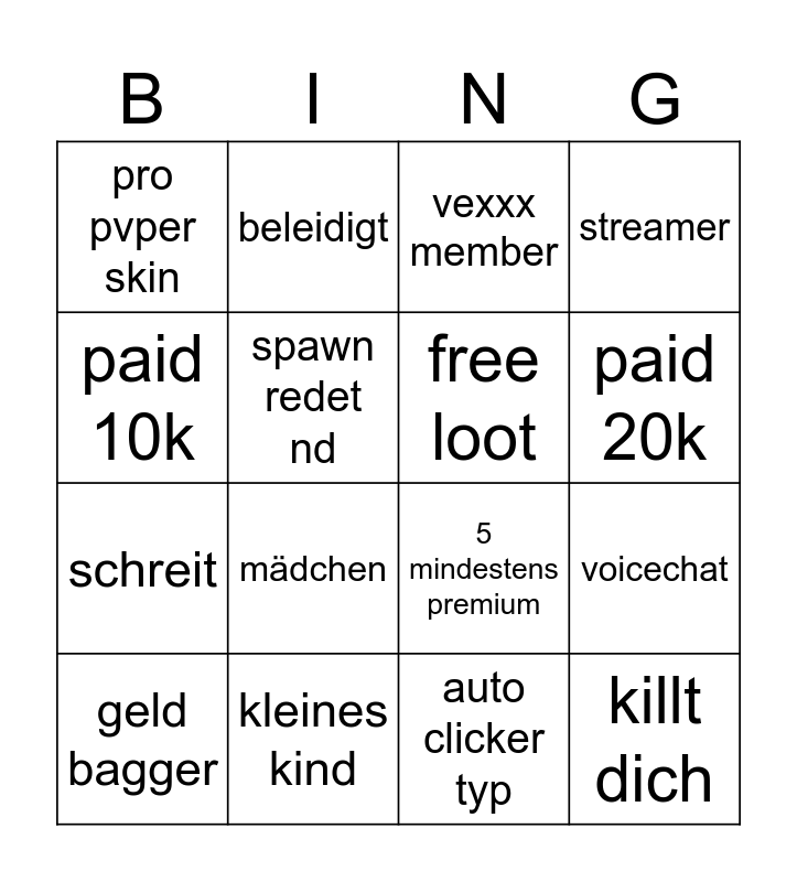 This bingo card has 16 words: kleines kind, voicechat, vexxx member, pro pvper skin, schreit, beleidigt, 5 mindestens premium, auto clicker typ, paid 10k, spawn redet nd, geld bagger, streamer, mädchen, paid 20k, free loot and killt dich.