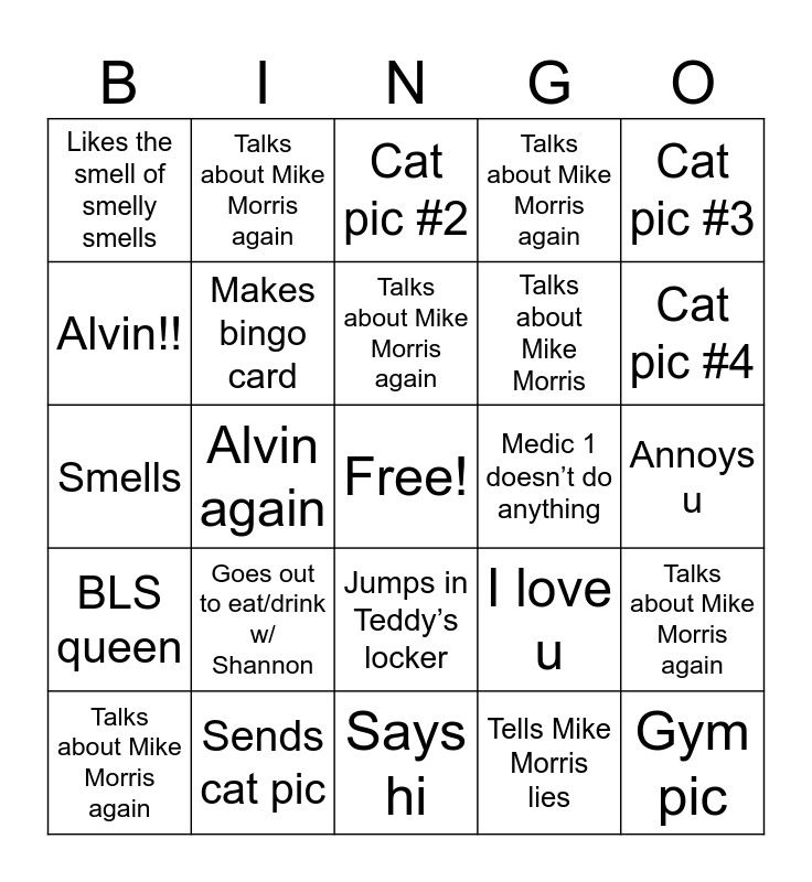 This bingo card has a free space and 29 words: Talks about Mike Morris again, Sends forehead pic, Alvin again, Idk, Likes the smell of smelly smells, Cat pic #2, Makes bingo card, Goes out to eat/drink w/ Shannon, Medic 1 doesn’t do anything, Sends cat pic, Annoys u, Gym pic, Says hi, Tells Mike Morris lies, Cat pic #4, Calls for paramedic when not needed, Jumps in Teddy’s locker, BLS queen, Cat pic #3, Smells, I love u, Says comes to work, Talks about Mike Morris, Alvin!!, Talks about Mike Morris again, Talks about Mike Morris again, Talks about Mike Morris again, Talks about Mike Morris again and Talks about Mike Morris again.