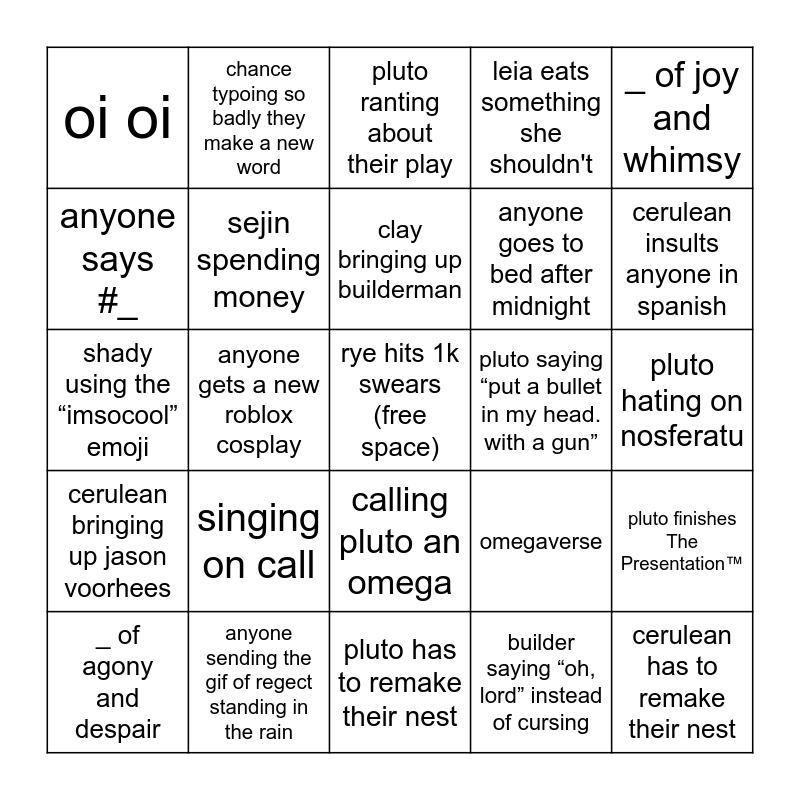 This bingo card has a free space and 34 words: holy _, batman, builder saying “oh, lord” instead of cursing, taph bringing up telamon, shady bringing up builderman, cerulean bringing up jason voorhees, sejin spending money, _ of joy and whimsy, _ of agony and despair, chance typoing so badly they make a new word, chance typoing so badly you can't tell what he's trying to say, clay bringing up builderman, pluto ranting about their play, anyone being freaky about forsaken characters specifically, directly quoting song lyrics, pluto saying “put a bullet in my head. with a gun”, cerulean insults anyone in spanish, anyone sending the gif of regect standing in the rain, shady using the “imsocool” emoji, singing on call, omegaverse, calling pluto an omega, 67, oi oi, pluto hating on nosferatu, pluto has to remake their nest, cerulean has to remake their nest, leia eats something she shouldn't, li drops the typing quirk, anyone goes to bed after midnight, anyone says #_, cerulean making coffee after the sun sets, anyone gets a new roblox cosplay, pluto finishes The Presentation™ and someone brings up their evil twin/evil alter.
