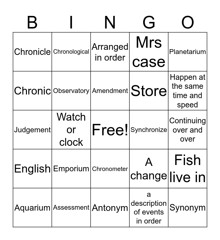 This bingo card has a free space and 24 words: Emporium, Assessment, Amendment, Aquarium, Planetarium, Chronicle, Chronic, Chronological, Synchronize, Chronometer, Store, Judgement, A change, Fish live in, Observatory, a description of events in order, Continuing over and over, Arranged in order, Happen at the same time and speed, Watch or clock, Synonym, English, Mrs case and Antonym.