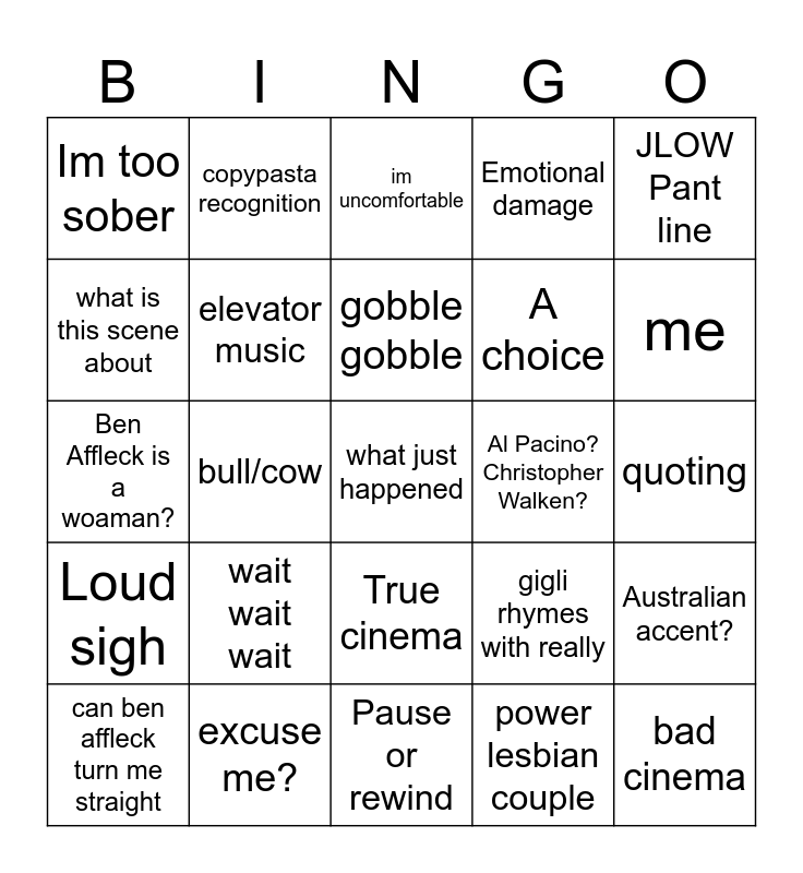 This bingo card has a free space and 24 words: wait wait wait, excuse me?, gobble gobble, can ben affleck turn me straight, JLOW Pant line, Im too sober, what is this scene about, copypasta recognition, Al Pacino? Christopher Walken?, True cinema, A choice, Ben Affleck is a woaman?, gigli rhymes with really, Australian accent?, elevator music, power lesbian couple, quoting, im uncomfortable, me, bull/cow, bad cinema, Loud sigh, Emotional damage and Pause or rewind.
