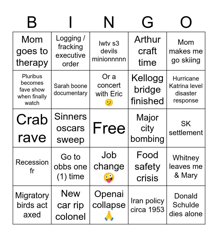 This bingo card has a free space and 24 words: Migratory birds act axed, Go to obbs one (1) time, Or a concert with Eric 🫤, Iran policy circa 1953, Mom makes me go skiing, Mom goes to therapy, Logging / fracking executive order, Iwtv s3 devils minionnnnn, Major city bombing, SK settlement, Crab rave, Sarah boone documentary, Food safety crisis, Whitney leaves me & Mary, Pluribus becomes fave show when finally watch, New car rip colonel, Openai collapse 🙏, Arthur craft time, Hurricane Katrina level disaster response, Recession fr, Sinners oscars sweep, Job change 🤪, Kellogg bridge finished and Donald Schulde dies alone.