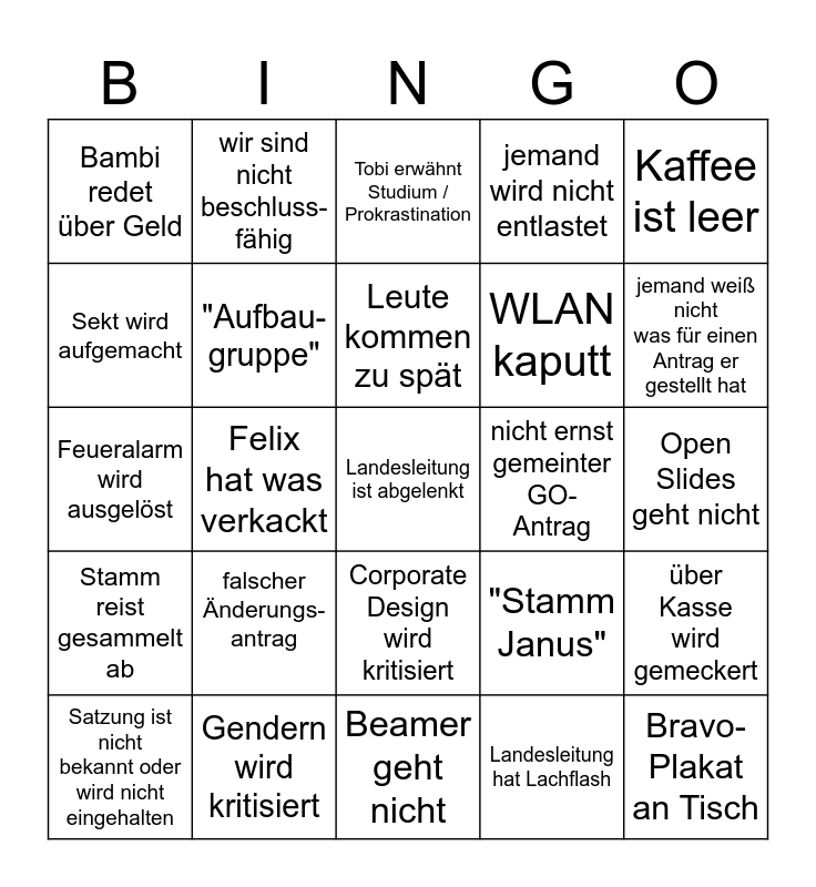 This bingo card has 30 words: Gendern wird kritisiert, emotionaler Redebeitrag, Felix hat was verkackt, dämliche Frage, Bambi redet über Geld, Tobi erwähnt Studium / Prokrastination, "Aufbau-gruppe", Corporate Design wird kritisiert, nicht ernst gemeinter GO-Antrag, Beamer geht nicht, Open Slides geht nicht, Landesleitung ist abgelenkt, Landesleitung hat Lachflash, Bravo-Plakat an Tisch, jemand weiß nicht was für einen Antrag er gestellt hat, "Stamm Störtebeker", "Stamm Janus", Stamm reist gesammelt ab, falscher Änderungs-antrag, Kaffee ist leer, Feueralarm wird ausgelöst, Dringlichkeits- antrag, wir sind nicht beschluss- fähig, WLAN kaputt, Sekt wird aufgemacht, jemand wird nicht entlastet, über Kasse wird gemeckert, Satzung ist nicht bekannt oder wird nicht eingehalten, Leute kommen zu spät and Abstimmung muss wiederholt werden.