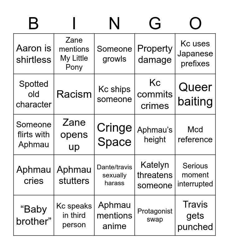 This bingo card has a free space and 24 words: Aphmau stutters, Kc speaks in third person, Kc ships someone, “Baby brother”, Kc uses Japanese prefixes, Aaron is shirtless, Spotted old character, Zane mentions My Little Pony, Aphmau’s height, Dante/travis sexually harass, Kc commits crimes, Someone flirts with Aphmau, Katelyn threatens someone, Serious moment interrupted, Racism, Protagonist swap, Mcd reference, Someone growls, Queer baiting, Zane opens up, Travis gets punched, Aphmau cries, Property damage and Aphmau mentions anime.