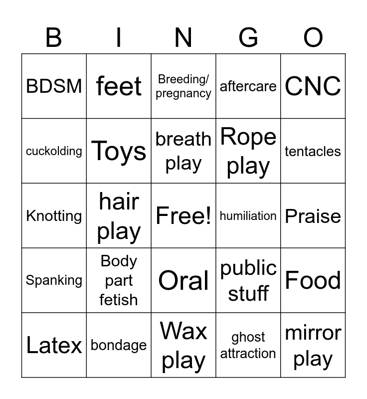 This bingo card has a free space and 24 words: Body part fetish, bondage, breath play, Latex, CNC, BDSM, cuckolding, feet, humiliation, Oral, Rope play, Knotting, public stuff, Food, Toys, ghost attraction, Praise, Breeding/ pregnancy, tentacles, hair play, mirror play, Spanking, aftercare and Wax play.