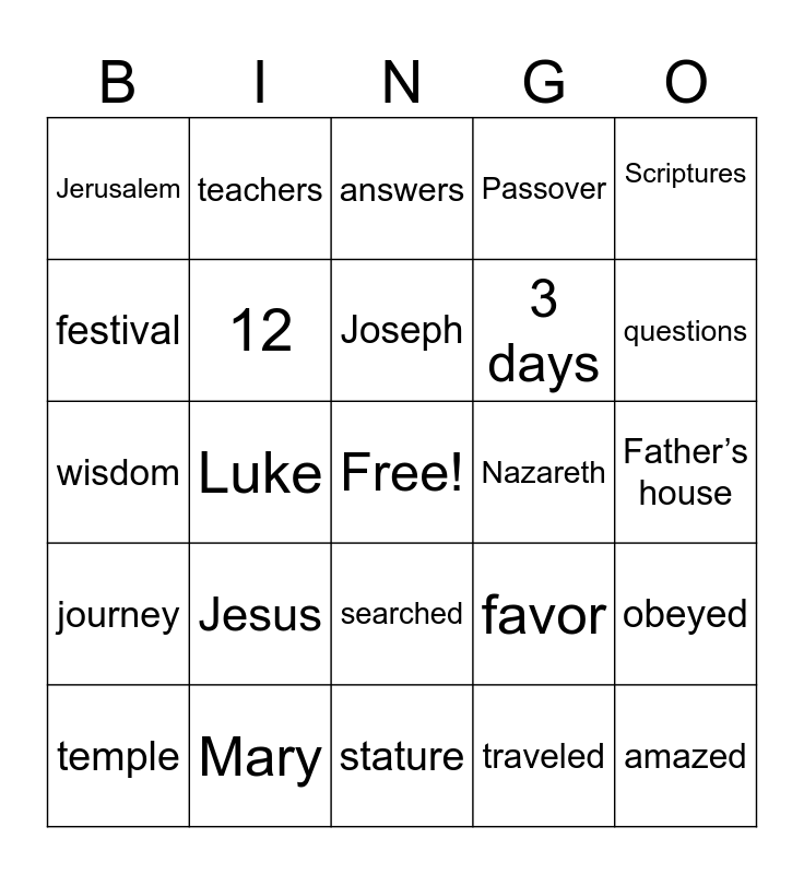 This bingo card has a free space and 24 words: Jesus, Mary, Joseph, temple, Scriptures, Jerusalem, festival, teachers, Nazareth, searched, 3 days, wisdom, favor, obeyed, 12, traveled, Father’s house, answers, questions, Luke, amazed, journey, Passover and stature.