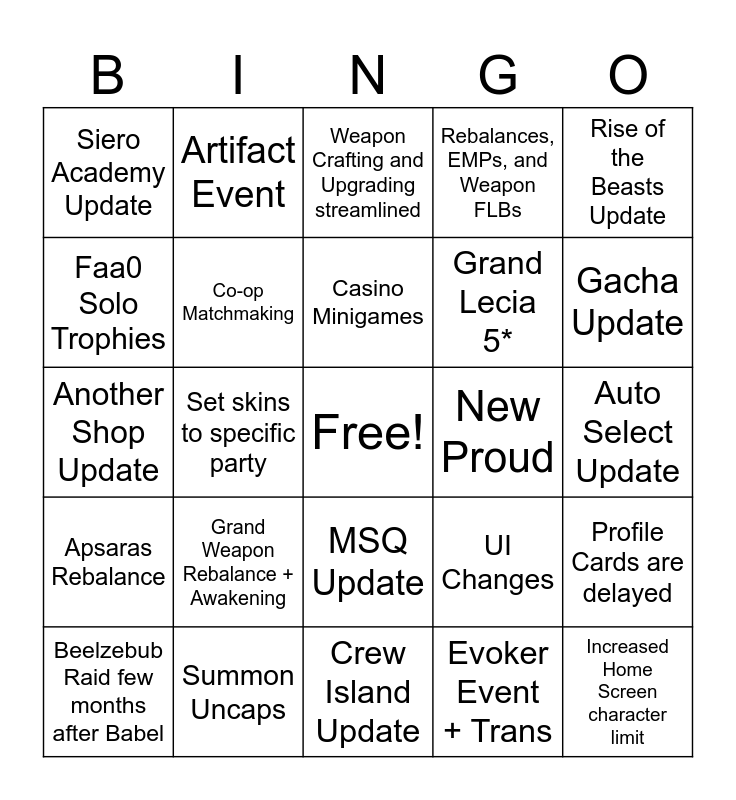 This bingo card has a free space and 24 words: Grand Weapon Rebalance + Awakening, Summon Uncaps, Casino Minigames, Beelzebub Raid few months after Babel, Rise of the Beasts Update, Siero Academy Update, Faa0 Solo Trophies, Artifact Event, New Proud, MSQ Update, Grand Lecia 5*, Another Shop Update, UI Changes, Profile Cards are delayed, Co-op Matchmaking, Evoker Event + Trans, Auto Select Update, Weapon Crafting and Upgrading streamlined, Gacha Update, Set skins to specific party, Increased Home Screen character limit, Apsaras Rebalance, Rebalances, EMPs, and Weapon FLBs and Crew Island Update.