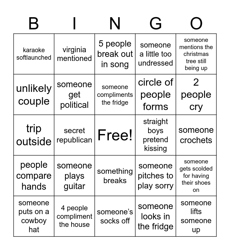 This bingo card has a free space and 24 words: someone plays guitar, 4 people compliment the house, someone compliments the fridge, someone puts on a cowboy hat, someone mentions the christmas tree still being up, karaoke softlaunched, unlikely couple, virginia mentioned, straight boys pretend kissing, something breaks, circle of people forms, trip outside, someone pitches to play sorry, someone gets scolded for having their shoes on, someone get political, someone looks in the fridge, someone crochets, 5 people break out in song, 2 people cry, secret republican, someone lifts someone up, people compare hands, someone a little too undressed and someone’s socks off.