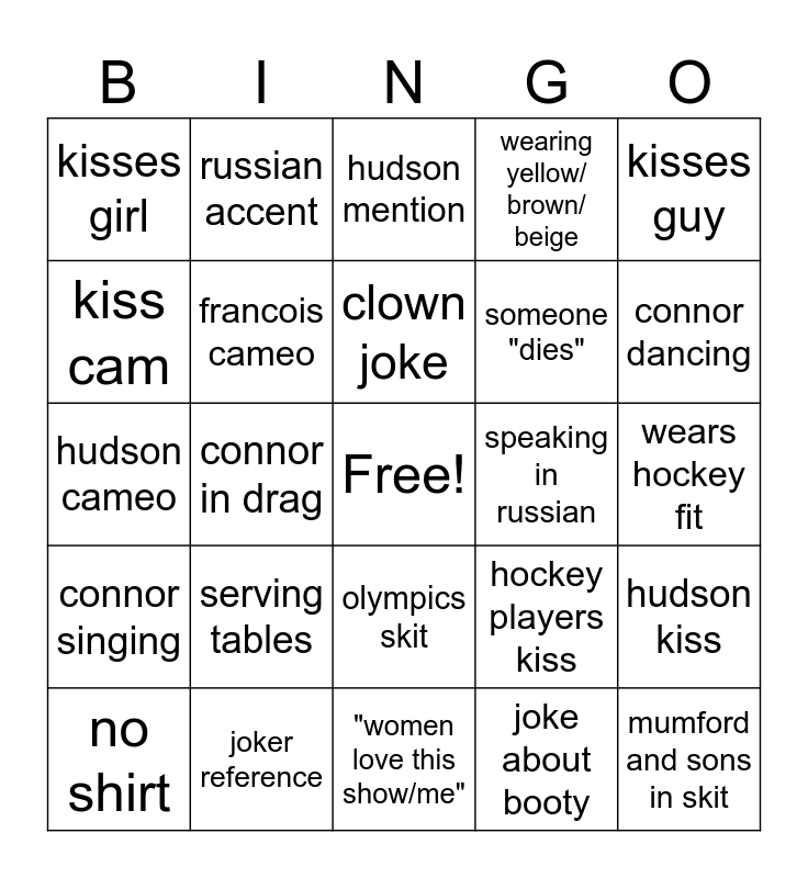 This bingo card has a free space and 24 words: no shirt, serving tables, clown joke, joke about booty, kisses guy, kisses girl, russian accent, hudson mention, speaking in russian, wears hockey fit, hudson cameo, francois cameo, hockey players kiss, hudson kiss, kiss cam, joker reference, "women love this show/me", wearing yellow/ brown/ beige, connor dancing, connor singing, connor in drag, olympics skit, someone "dies" and mumford and sons in skit.
