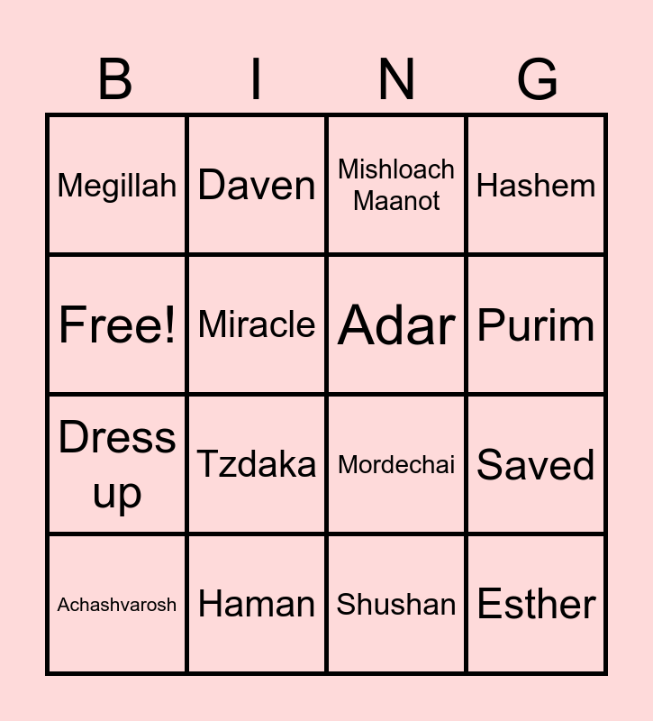 This bingo card has 16 words: Haman, Saved, Mishloach Maanot, Megillah, Dress up, Daven, Mordechai, Shushan, Free!, Miracle, Achashvarosh, Hashem, Tzdaka, Purim, Adar and Esther.
