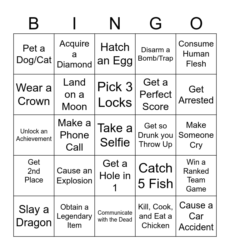 This bingo card has 25 words: Cause an Explosion, Communicate with the Dead, Pick 3 Locks, Slay a Dragon, Consume Human Flesh, Pet a Dog/Cat, Wear a Crown, Acquire a Diamond, Get so Drunk you Throw Up, Get a Hole in 1, Get a Perfect Score, Unlock an Achievement, Catch 5 Fish, Win a Ranked Team Game, Land on a Moon, Cause a Car Accident, Make Someone Cry, Hatch an Egg, Get Arrested, Make a Phone Call, Take a Selfie, Obtain a Legendary Item, Get 2nd Place, Disarm a Bomb/Trap and Kill, Cook, and Eat a Chicken.