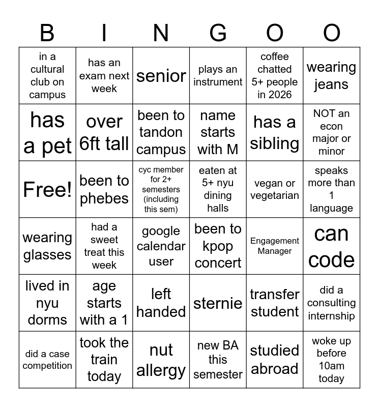 This bingo card has 36 words: sternie, left handed, new BA this semester, has a pet, wearing glasses, eaten at 5+ nyu dining halls, over 6ft tall, nut allergy, coffee chatted 5+ people in 2026, transfer student, NOT an econ major or minor, plays an instrument, did a consulting internship, been to phebes, name starts with M, in a cultural club on campus, lived in nyu dorms, vegan or vegetarian, Free!, senior, cyc member for 2+ semesters (including this sem), had a sweet treat this week, been to kpop concert, google calendar user, Engagement Manager, has an exam next week, has a sibling, took the train today, been to tandon campus, wearing jeans, woke up before 10am today, did a case competition, can code, speaks more than 1 language, age starts with a 1 and studied abroad.