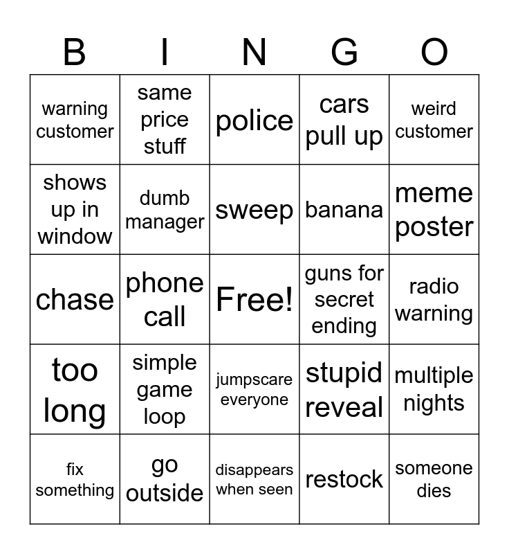 This bingo card has a free space and 24 words: simple game loop, go outside, sweep, fix something, weird customer, warning customer, shows up in window, same price stuff, guns for secret ending, jumpscare everyone, banana, chase, stupid reveal, multiple nights, dumb manager, restock, radio warning, police, meme poster, phone call, someone dies, too long, cars pull up and disappears when seen.