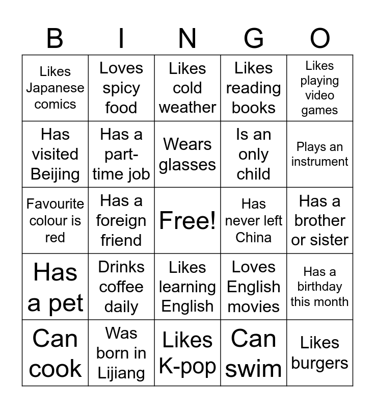 This bingo card has a free space and 25 words: Has a pet, Was born in Lijiang, Likes K-pop, Can swim, Likes playing video games, Likes Japanese comics, Loves spicy food, Likes cold weather, Has never left China, Has a birthday this month, Has visited Beijing, Has a part-time job, Wants to study abroad, Loves English movies, Plays an instrument, Can cook, Has a foreign friend, Wears glasses, Is an only child, Has a brother or sister, Favourite colour is red, Drinks coffee daily, Likes learning English, Likes reading books and Likes burgers.