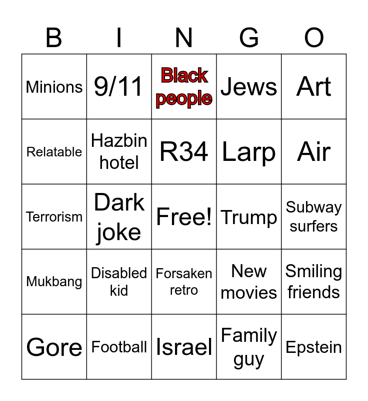 This bingo card has a free space and 24 words: Disabled kid, Football, R34, Gore, Art, Minions, Relatable, 9/11, Trump, Forsaken retro, Larp, Terrorism, New movies, Smiling friends, Hazbin hotel, Family guy, Subway surfers, Black people, Air, Dark joke, Epstein, Mukbang, Jews and Israel.